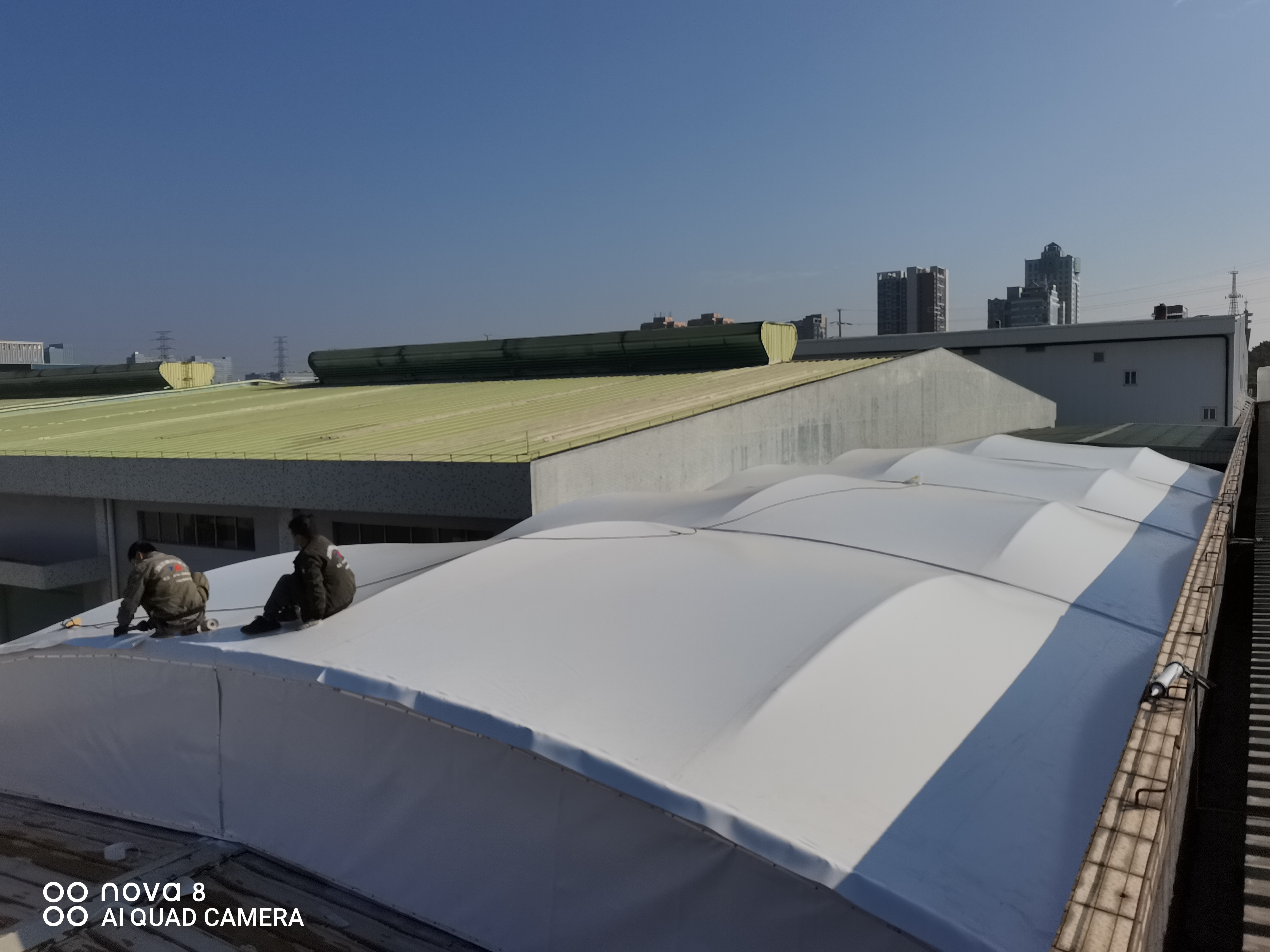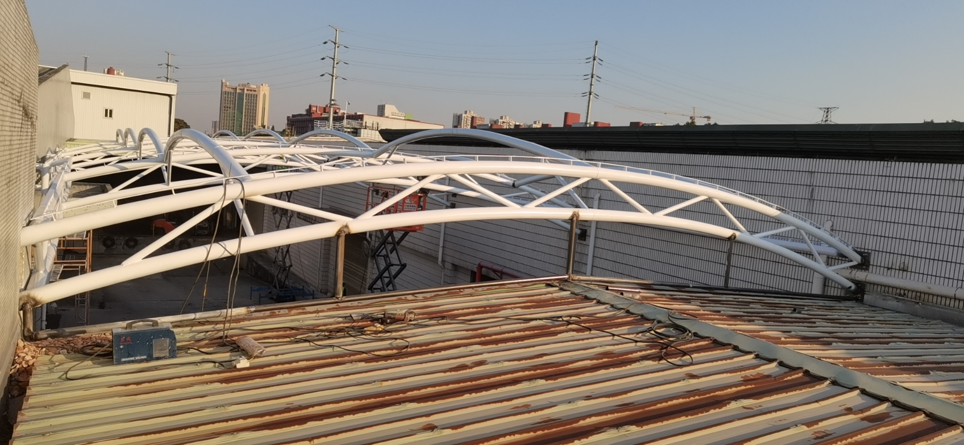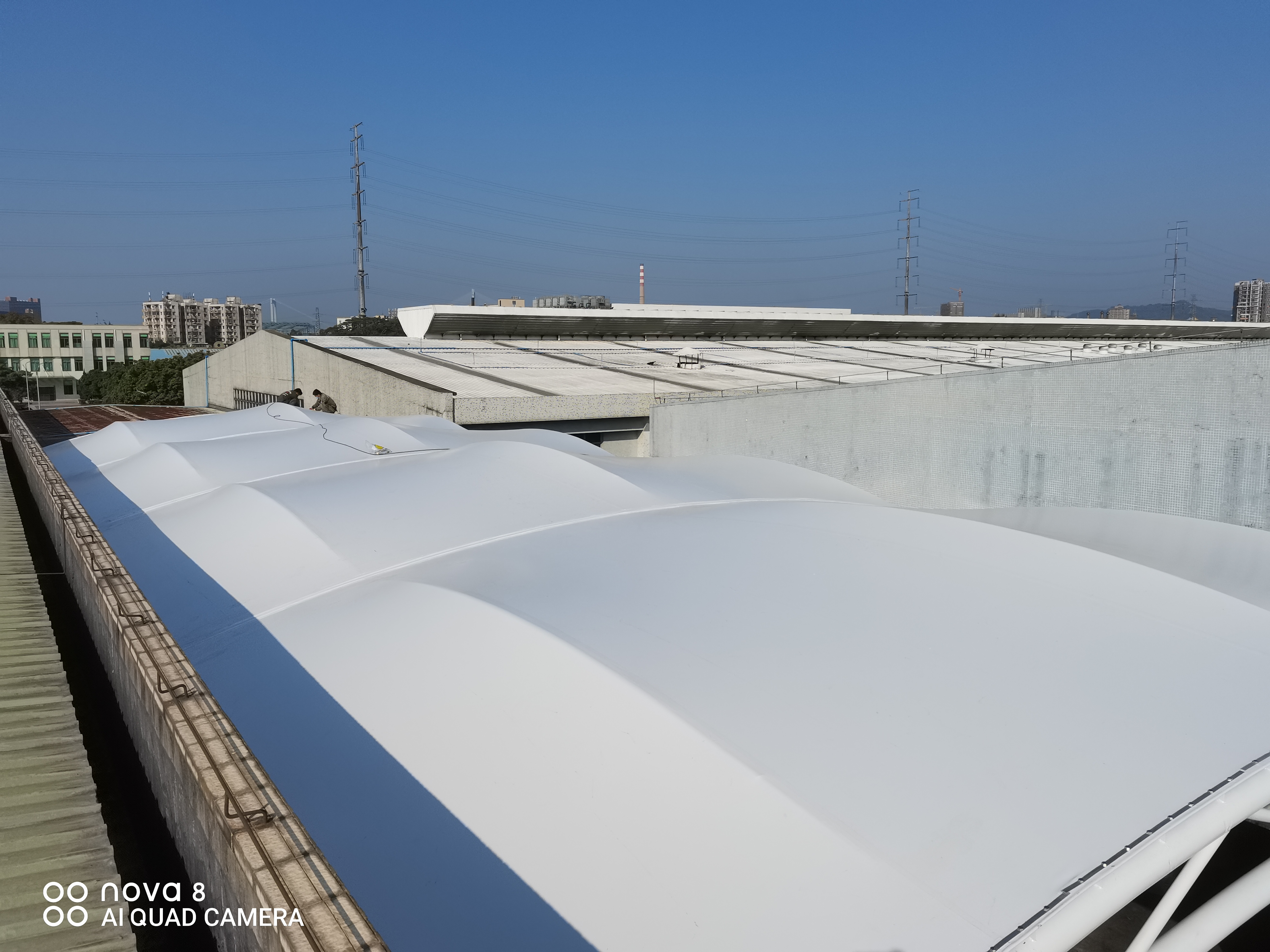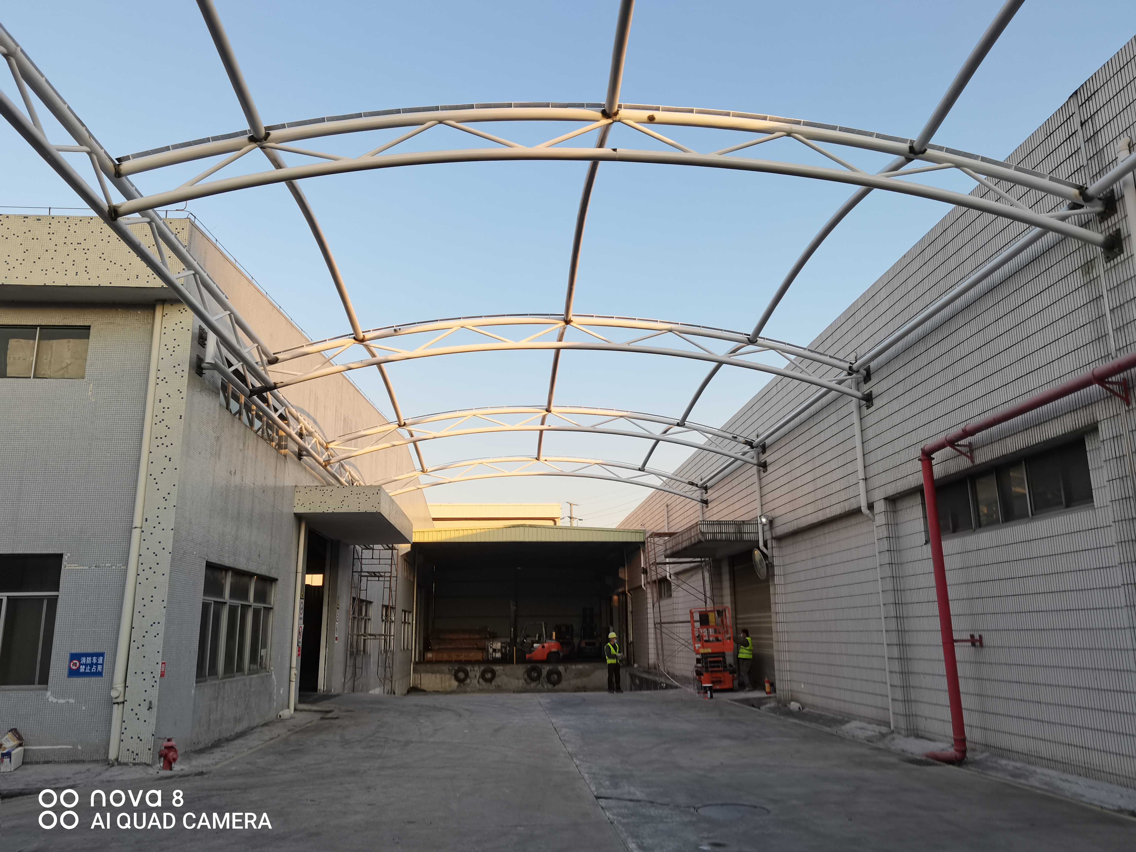 永豐余紙業(yè)(廣州)有限公司位于廣東省廣州市黃埔區(qū)夏園路5號,是方便裝卸原材料建設的走廊天幕,位于兩個生產車間之間,采用管桁架加膜結構雨棚。案例如下: