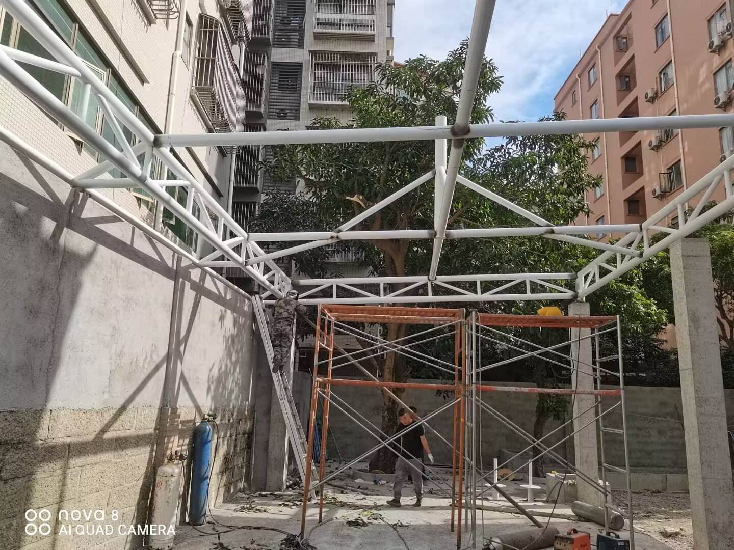 東莞別墅餐廳膜結構雨棚是私人別墅做的餐廳雨棚項目,采用混凝土立柱加管桁架膜結構雨棚,案例如下: